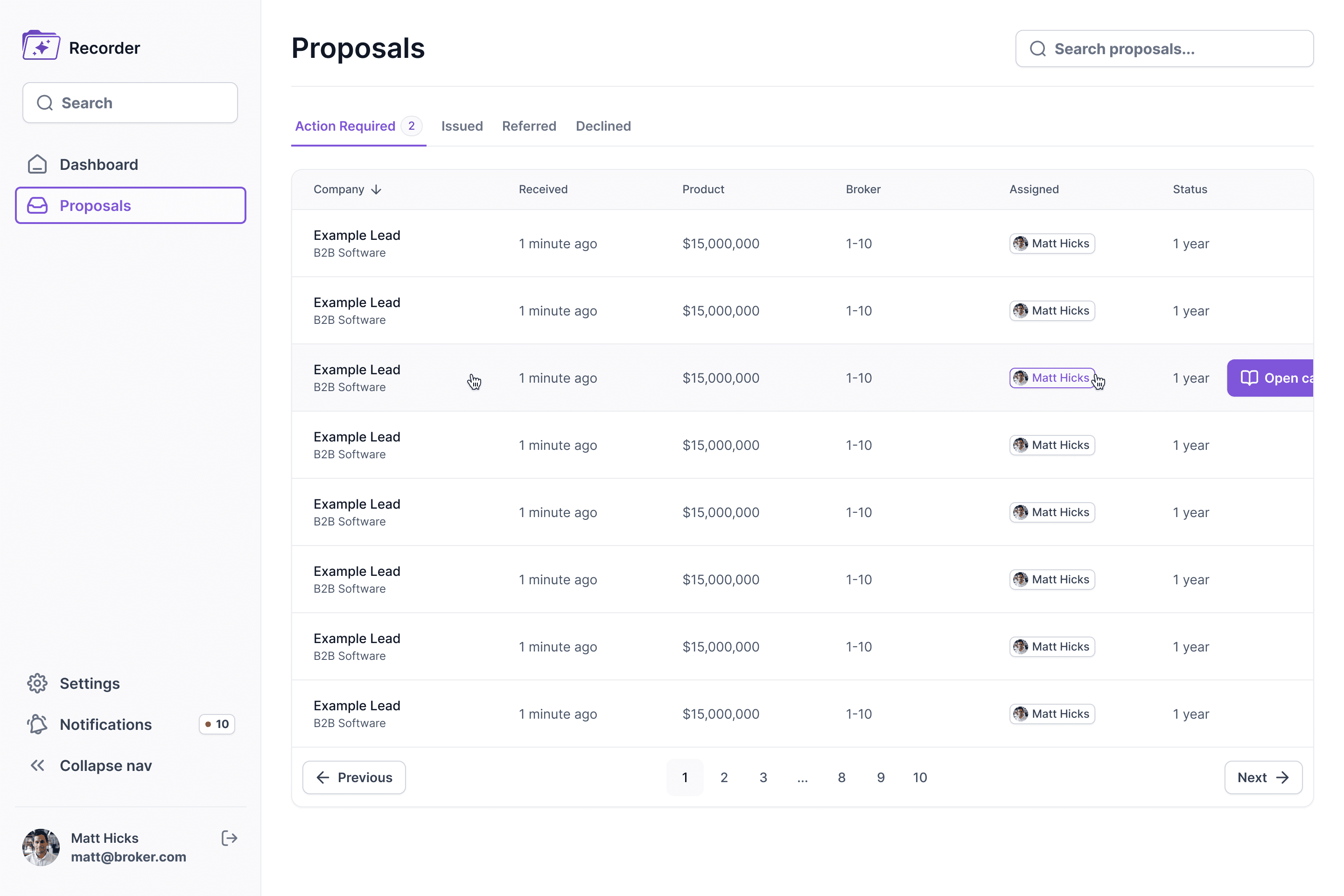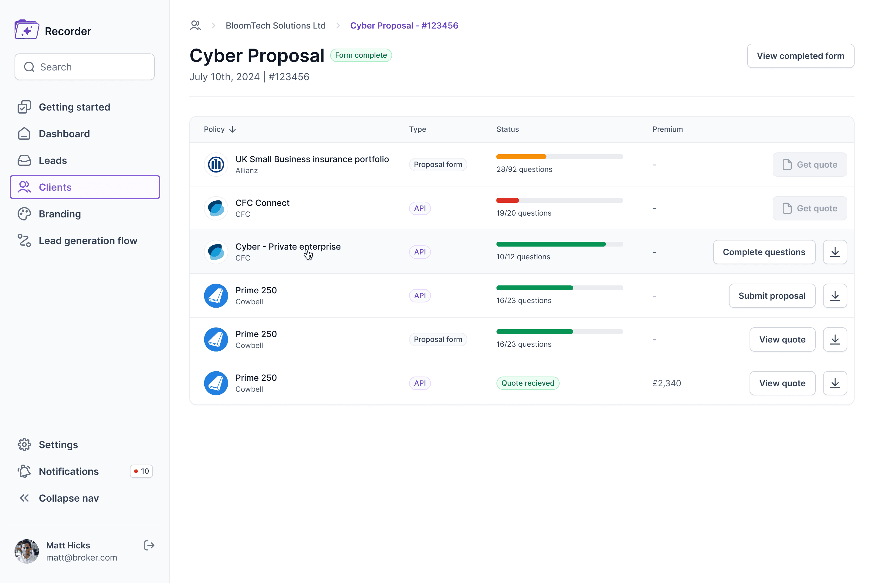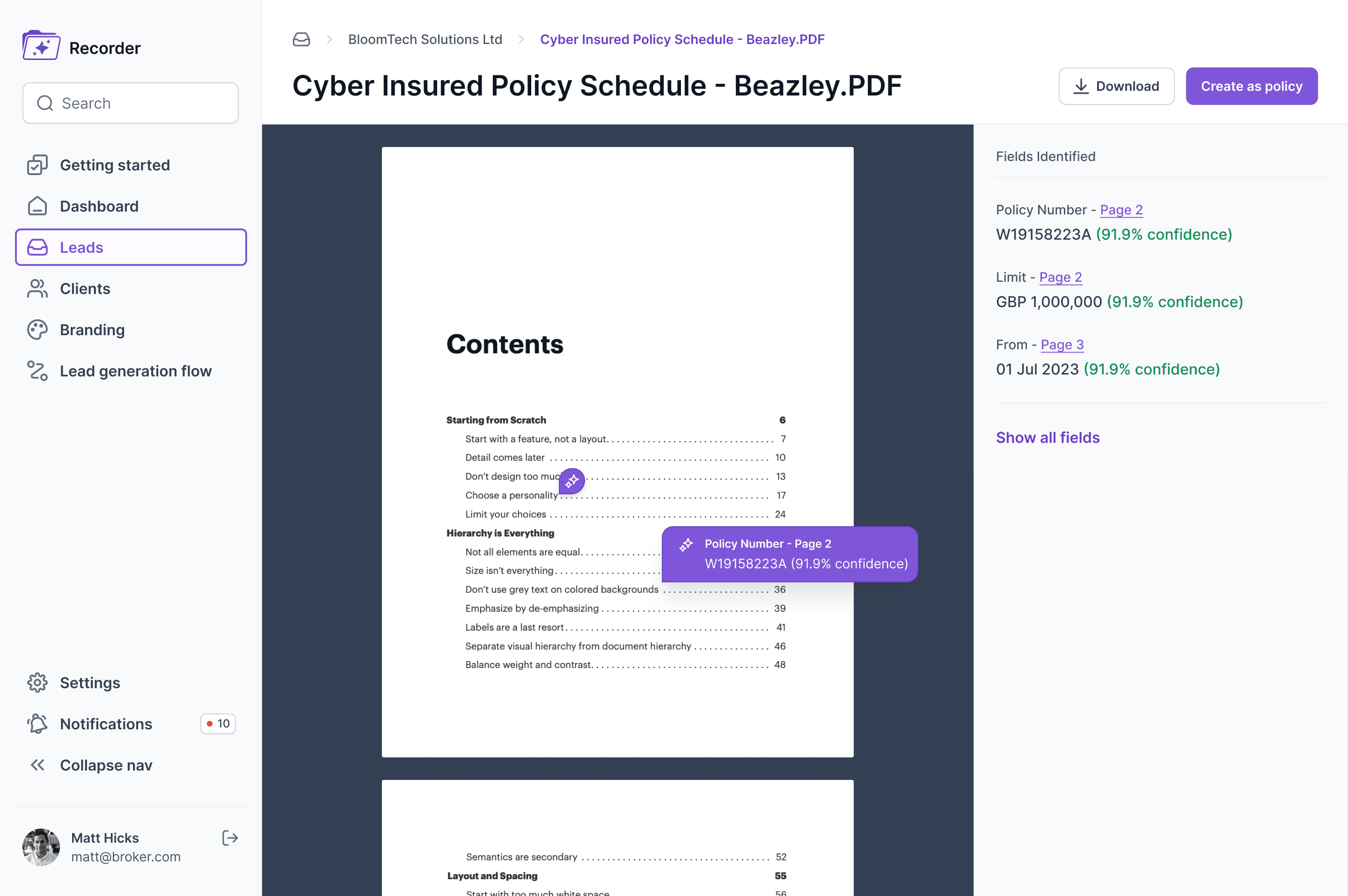Our goal was to design a sleek and user-friendly MVP interface for Recorder. A platform tailored to commercial insurance brokers in the UK, leveraging AI technology to streamline operations, helping brokers access the best tools for managing their workflows efficiently.