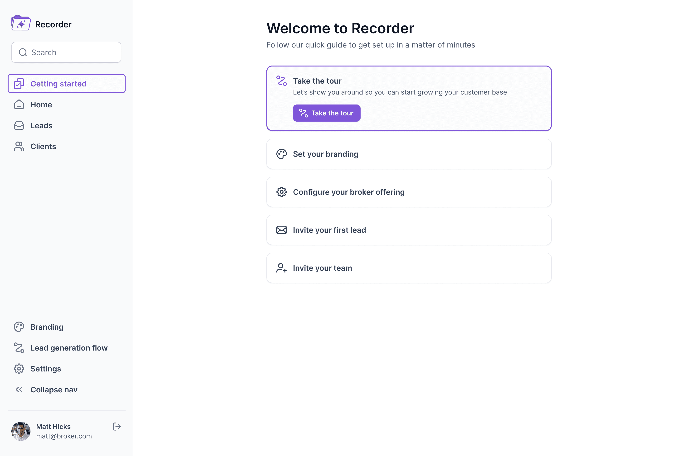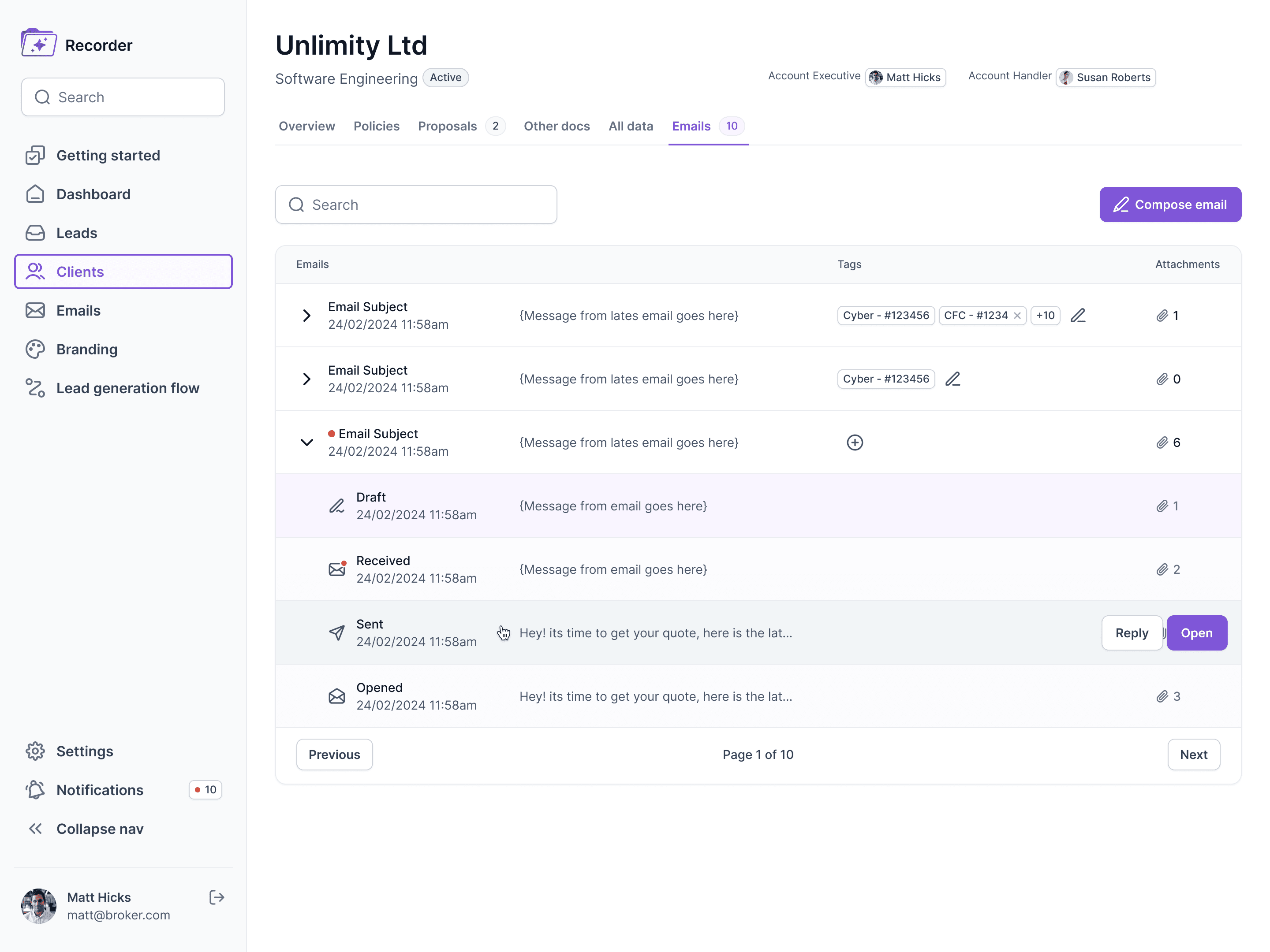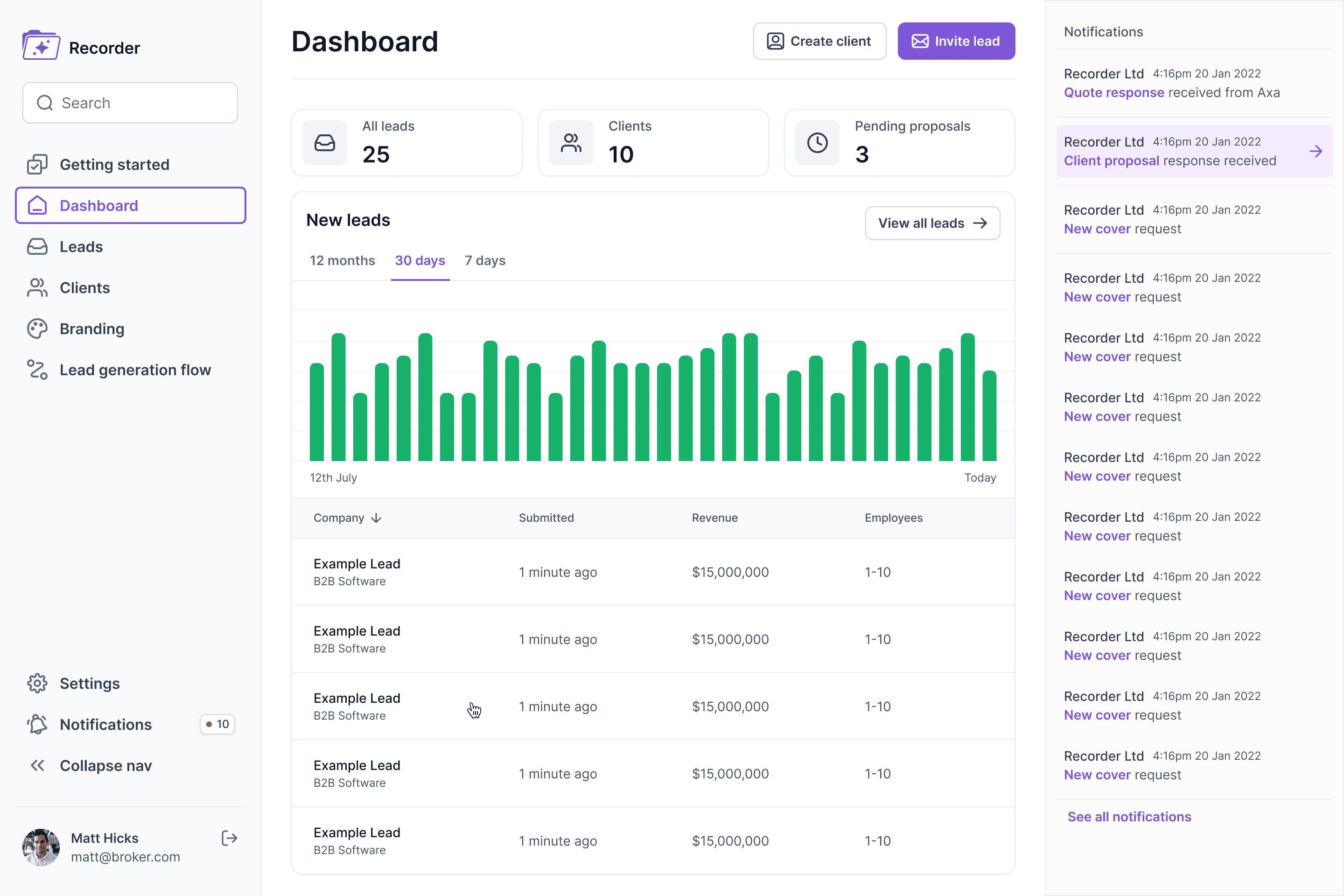 Our goal was to design a sleek and user-friendly MVP interface for Recorder. A platform tailored to commercial insurance brokers in the UK, leveraging AI technology to streamline operations, helping brokers access the best tools for managing their workflows efficiently.